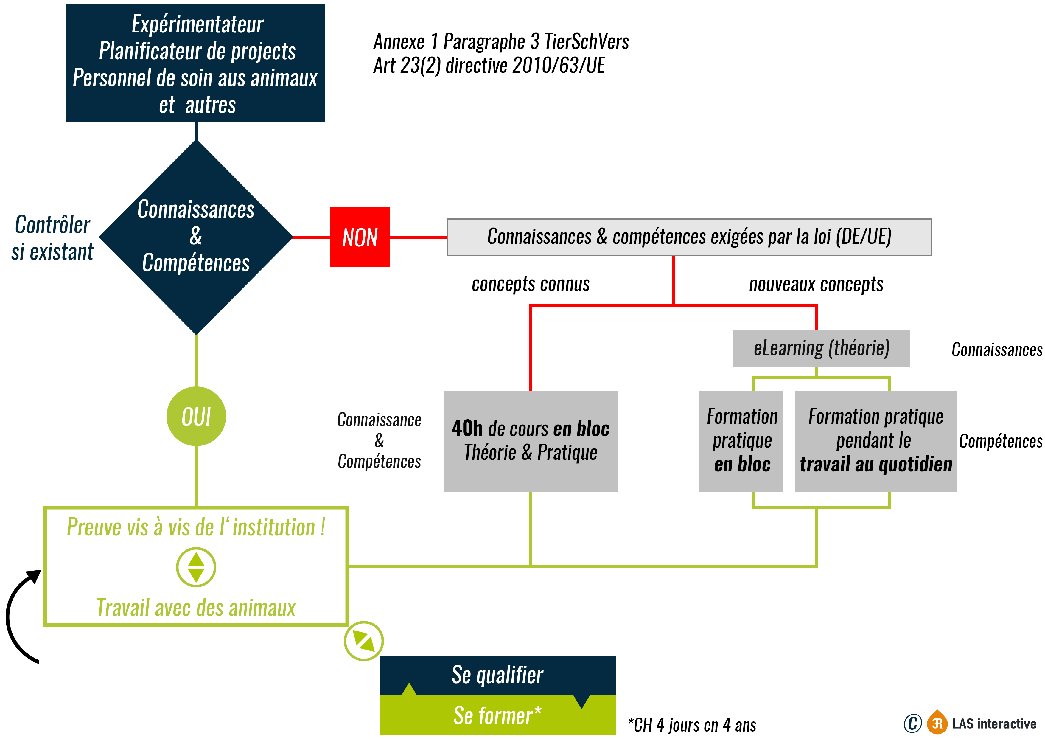 La réalisation des essais est par exemple soumise à des procédures administratives d’autorisation ou de notification préalables. De plus, toutes les personnes réalisant des expérimentations animales ou travaillant avec des animaux d’expérience doivent être compétentes et continuellement formées. Les thèmes de la formation de base sont légalement fixés depuis 2013 et sont valables dans toute l’Union européenne. En Allemagne, ce qui est appelé le certificat de compétence concerne surtout le personnel scientifique et/ou technico-scientifique des universités, des établissements de recherche et de l’industrie travaillant avec des animaux d’expérience.