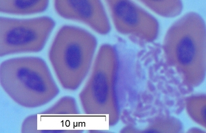 Beim Vogel besitzen die "neutrophilen" Granulozyten prominente eosinophile Granula und werden daher heterophile Granulozyten genannt. HeterophileGranulozyten machen circa 45 % aller Leukozyten bei den Vögeln aus.