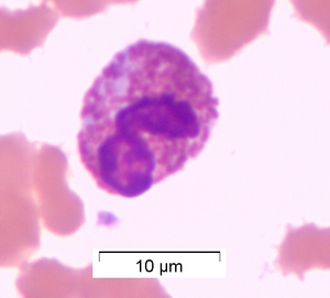 Eosinophile Granulozyten machen im Blutausstrich bei der Katze 3 - 6 % aller Leukozyten aus.